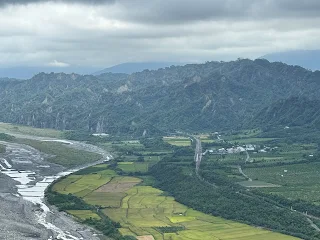 卑南溪與鹿寮溪交會處,沖毀了部分新良濕地公園,荷花池消失了。花藞藞鳥瞰鹿野溪與卑南溪交會處,溪谷建構的台灣圖案+愛心不見了!鄭先生說11月或許會復原。這次看了鳴日號、普悠瑪、區間車等3種火車駛過鹿野溪鐵橋、叢林、稻田往山里火車站,眺望遠方模糊的鵝鑾鼻佳樂水,看到對面山頂地母八卦廟…。離開時看到一群可愛的貓咪,老闆娘說有22隻,每隻貓咪的名字她都記得。