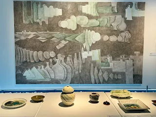 鶯歌陶瓷博物館B1咖啡店休息好久,終於開張了甘樂茶事,豆漿,咖啡、茶飲…。B1陶藝長廊陳列陳銘政的形溯-土塑個展20組件作品,創作者透過作品述說生活觀察與人生體悟,原本從事金屬工藝創作,後來自我內心摸索,終於尋找到自己對泥土的真愛,透過大小黏土堆疊與輕重推壓形塑肌理的生命。