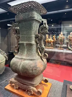 《蟠龍方壺》高90.3cm 口徑19.8x14cm,蟠龍方蓋沿寬厚,上接鏤空網狀的蟠蛇紋蓋冠,蓋冠以失蠟法製作而成。兩側附耳作立體鏤空回首的龍形圓雕一對,圈足下設一吐舌的虎形立雕,製作精良,珍貴無比。